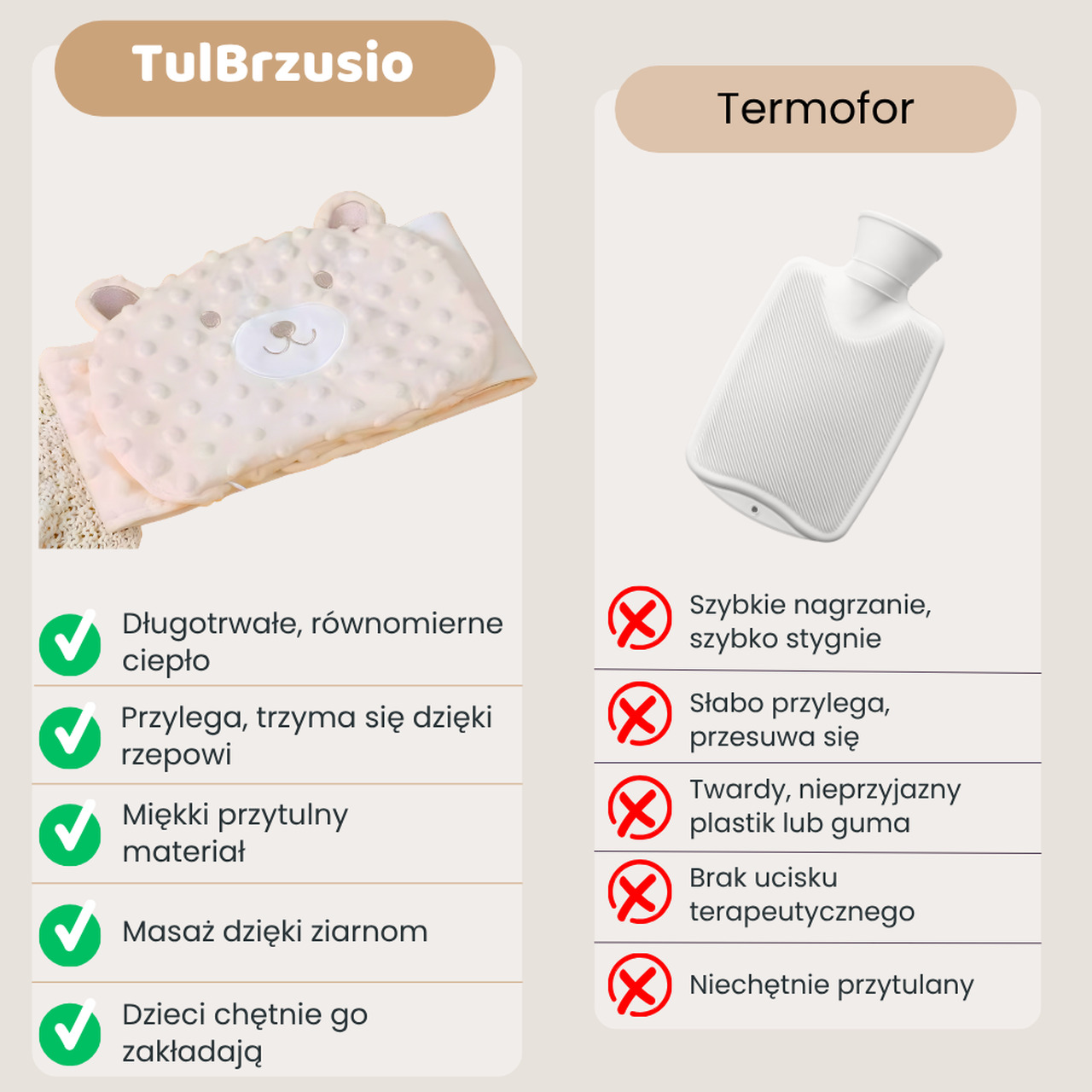 TulBrzusio staje się aktywnym kompresem niemal natychmiast, co pozwala uniknąć długiego płaczu dziecka i stresu związanego z tradycyjnym przygotowywaniem termoforów.